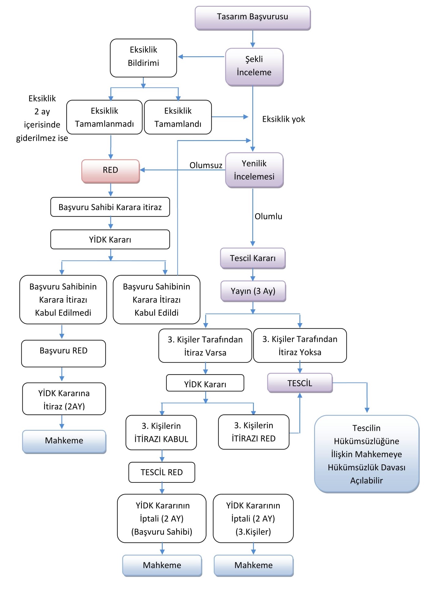 TPK yapılan başvuruyu öncelikle şekilsel olarak inceler. Bu inceleme yaklaşık 1 ay sürer. Sonrasında TPK başvuruyu Endüstriyel Tasarım Bülteni adı verilen yayında kamuoyunun bilgisine açar. Tasarımlar bu bültende 3 ay boyunca 3. şahısların itirazlarına açıktır. Herhangi bir itiraz gelmemesi durumunda TPK tasarımın belgeye bağlanıp tesciline karar verir. Toplamda bu süreç yaklaşık 5-6 ay sürer.